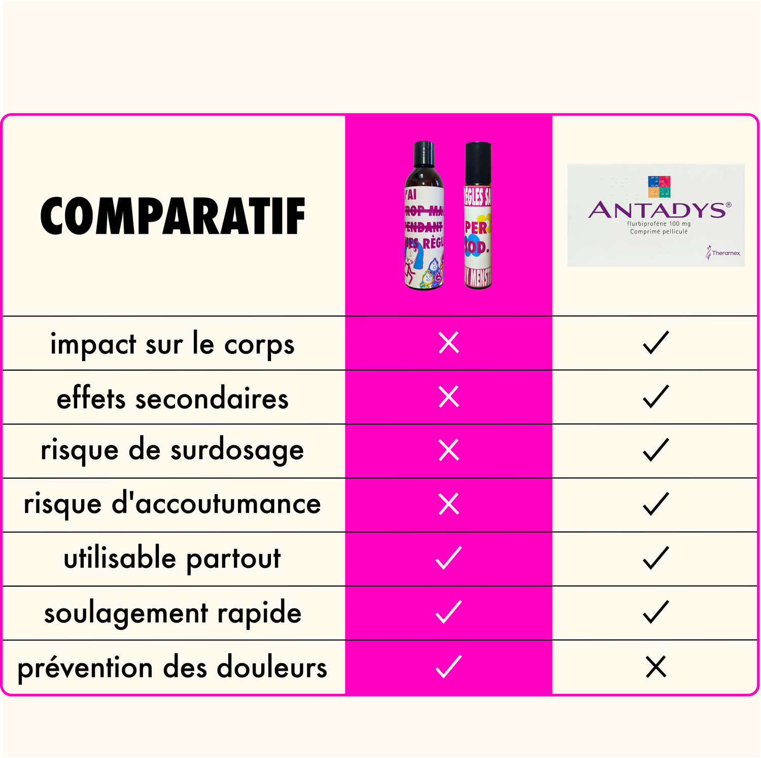 Nos solutions s'utilisent indépendamment ou en complément d'un antidouleur menstruel (Spasfon, Antadys, ...).